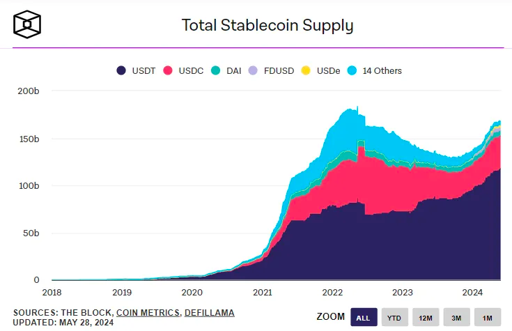 The total issuance of dollar-backed stablecoins has risen by nearly 25% this year, reaching $167 billion, exceeding the GDP of Ukraine and doubling that of Luxembourg.