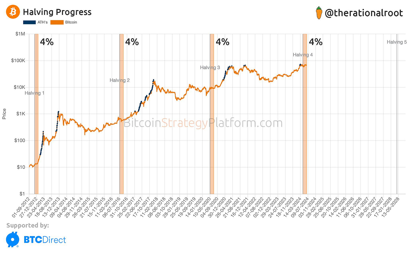 BTC is still currently trading within a relatively tight range, with the selling pressure likely coming from some miners selling BTC to cover operating costs post-halving. This pattern might suggest a gentle upward trend until September, similar to the post-halving pattern seen in 2020. However, the macro environment is different now, with US interest rates at 5.25% compared to 0% in 2020, and the potential for less liquidity injection to avoid market destabilisation.
