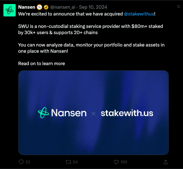 In 2024, Nansen acquired Stakewithus, a non-custodial staking platform with over 30,000 users, adding staking analytics to its offering. The move diversified its revenue streams and brought in an additional $1B in TVL.