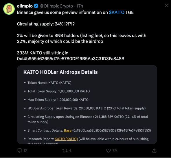 According to information hinted at by Binance, KAITO might have a total supply of 1 billion tokens, with 33% (~333 million KAITO) allocated for airdrops, and an initial circulating supply of approximately 241 million KAITO (24.14% of the total). Exchange listings are anticipated on Binance, OKX, Kraken, and others. Additionally, Binance has reportedly set aside 20 million KAITO for an airdrop to BNB holders, scheduled from February 6 to 10, 2025.