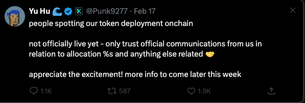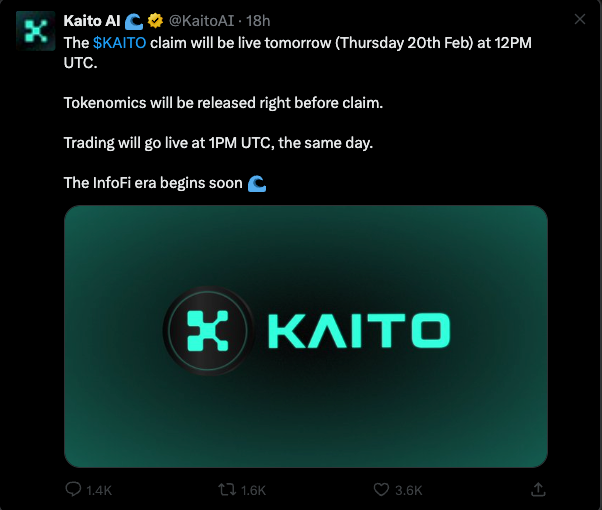 While detailed tokenomics have not been disclosed, the KAITO airdrop and launch will take place on February 20. The snapshot for the airdrop has already been taken, with claims going live at 12:00 PM UTC, followed by trading at 1:00 PM UTC.