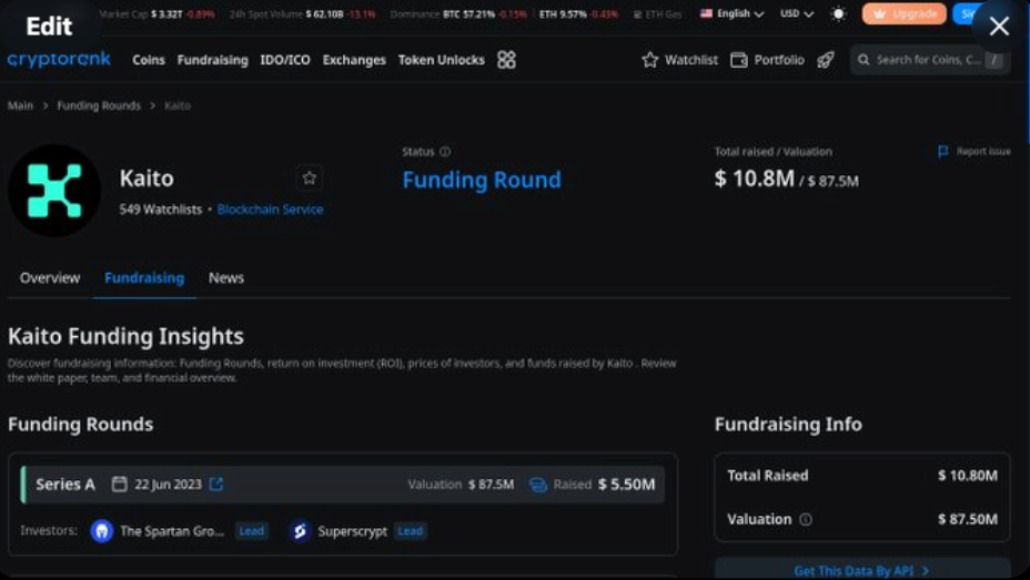Kaito AI is a next-generation Web3 search engine; built to streamline the fragmented crypto information landscape. Founded in 2022 by @Punk9277, Kaito has secured $10.8 million in funding from notable backers. In February 2023, Kaito raised $5.3 million in a seed round led by Dragonfly Capital, with participation from Sequoia Capital China, Jane Street, and others. Subsequently, in June 2023, Kaito secured an additional $5.5 million in a Series A funding round at an $87.5 million valuation, led by Superscrypt and Spartan.